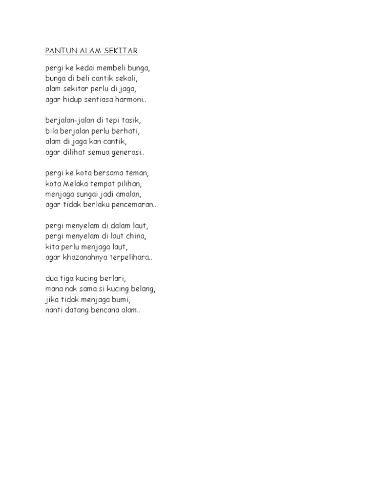 Puisi tentang alam singkat sajak twitter. Pemahaman pelajar tentang alam sekitar fizikal dan alam sekitar manusia dapat menerapkan semangat patriotik serta mewujudkan sensitiviti murid terhadap fenomena alam secara setempat dan global. Contohnya biaya pemulihan pencemaran lingkungan sekitar Rp6 triliun yang merupakan biaya keseluruhan KKKS PT.