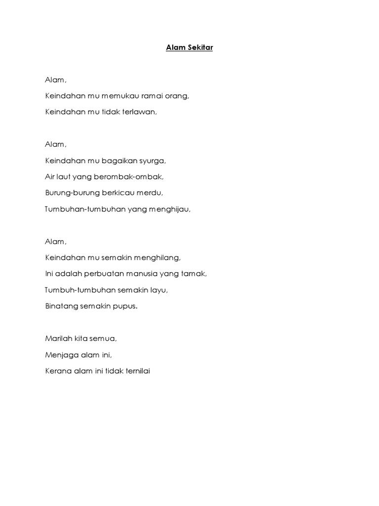 Dalam sajak berdiri aku tergambar sikap pesimis penyair dalam mengadapi permasalahan hidupnya sikap pesimis. Save Save Sajak Alam Sekitar For Later. Sajak tema alam sekitarSajak Alam Sekitar Alam Keindahan mu memukau ramai orang Keindahan mu tidak terlawan Alam Keindahan mu bagaikan syurga Air laut yang berombak-ombak.