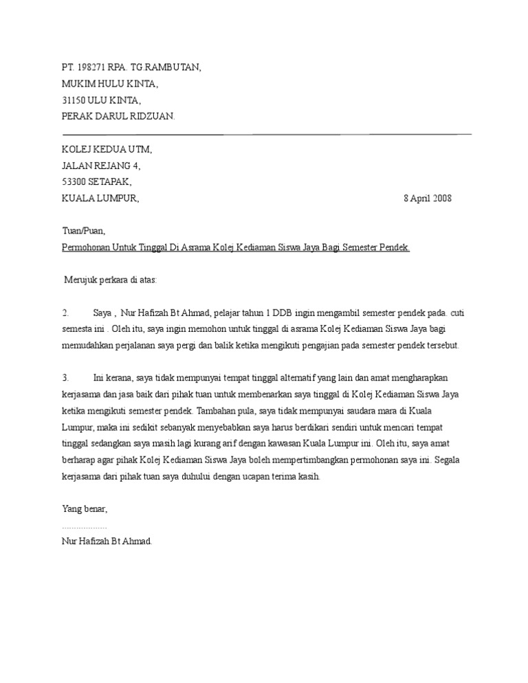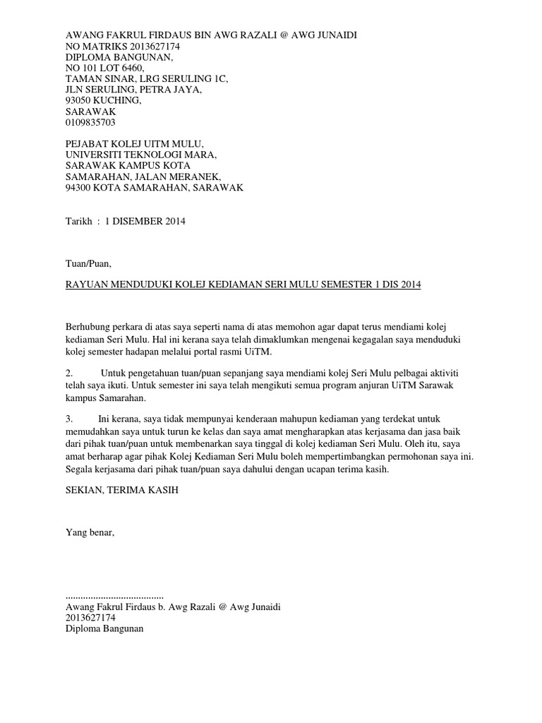 Surat rasmi permohonan kolej kediaman uitm contoh surat rasmi permohonan kolej contoh surat rasmi permohonan surat rasmi permohonan kerja surat rasmi permohonan cuti surat rasmi permohonan rentas negeri surat rasmi permohonan maaf surat rasmi permohonan bantuan kewangan surat rasmi permohonan mengadakan program surat rasmi. Contoh Surat Rayuan 2010 Rizlan Bin Rizman Taman Permata 3 43100 Sabak Bernam Selangor Darul Ehsan Tuan Pengetua Sekolah Menengah Kebangsaan Sri Mawar Course Hero. Pengetua Kolej Unit Pengurusan Kolej UiTM Cawangan Selangor Kampus Dengkil 43800 Dengkil Selangor Tuan PERMOHONAN KEBENARAN TINGGAL DI KOLEJ KEDIAMAN SEPANJANG CUTI PERTENGAHAN SEMESTER CUTI SEMESTER Perkara di atas adalah dirujuk dan berkaitan.