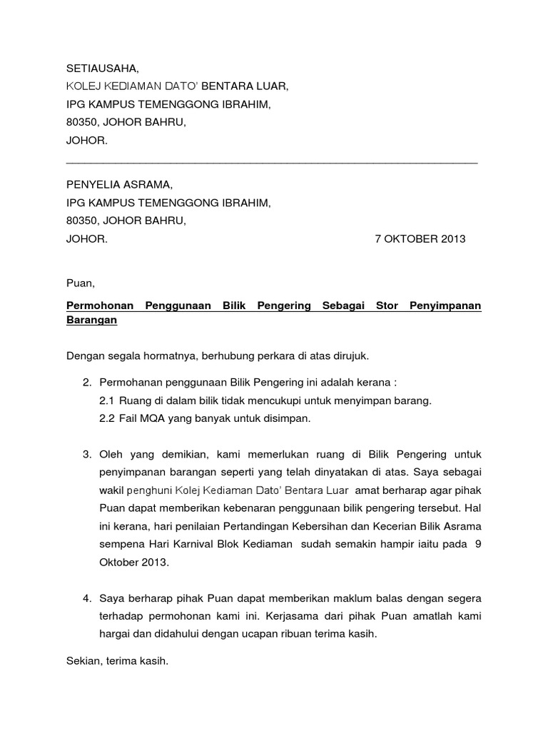 Contoh Surat Rasmi Permohonan Tinggal Di Kolej Surasmi F Otosection